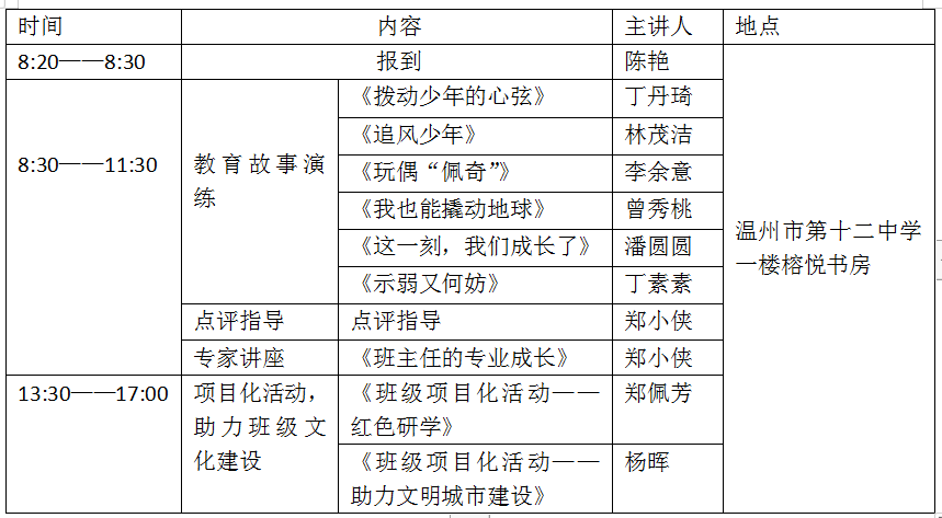 杨旭道   95年温师院中文系毕业一直工作到如今,班主任担任18年,曾荣获“温州市优秀班主任称号”。始终相信:教育中倾注了爱,教师就会用欣赏的眼光看待学生每一个幼稚的想法;用宽容对待学生成长中的不足;用发展的眼光期待他们的成长。