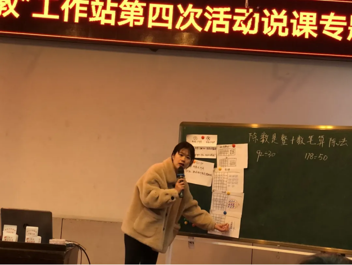 李婷婷老师的课题是《除数是整十数的笔算除法》,基于教材的分析立足学生计算问题的实情,制定了三维教学目标,设计层次鲜明,特别是针对学生出现的图与式子对应断层的现象,借助几何直观,通过不同类型的图与式的对应,丰富学生的认知,帮助学生用包含除理解除数是整十数的除法。