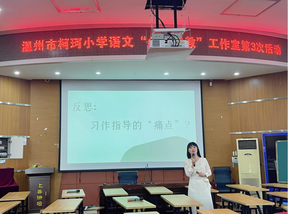 随后,工作室导师柯珂为两节习作展示课进行精准点评,并围绕课堂所生成的教学问题作了题为《写作支架:指向习作指导的效度》讲座。