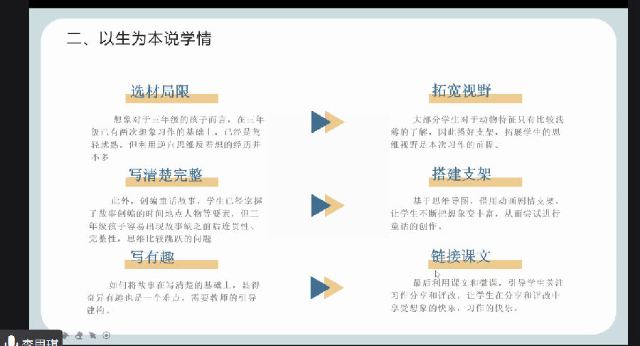 陈路萍、陈小静两位老师的写人类习作说课,通过结合事例创设情境等一系列方法,层层推进,让习作有架可依,学生能够写出人物的特点,大大降低习作的难度。