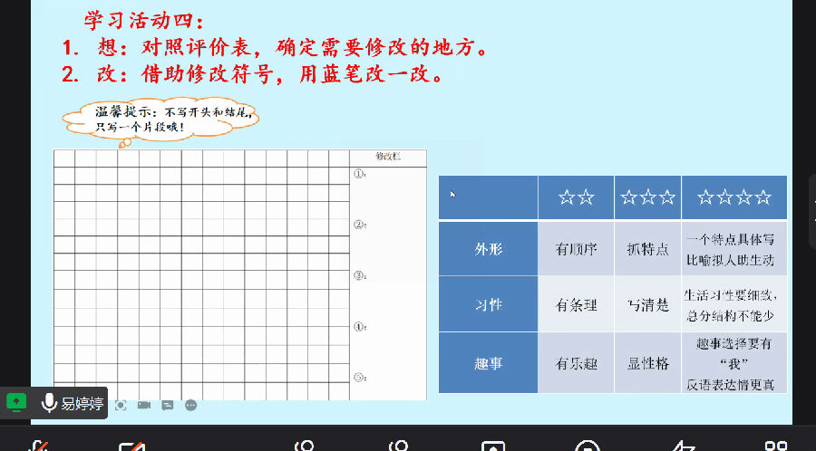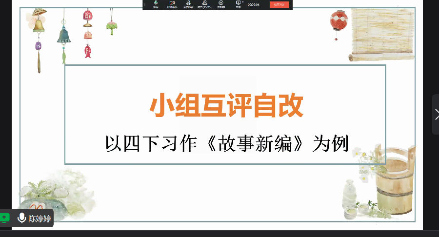《学生自评互改,提升写作能力》是陈婷婷老师的分享,她从学生自评互改的角度去提升学生习作能力。搭建小组,制定评价规则、标准,在她搭建自评互改评改机制下,学生独立自主学习意识显著提高。