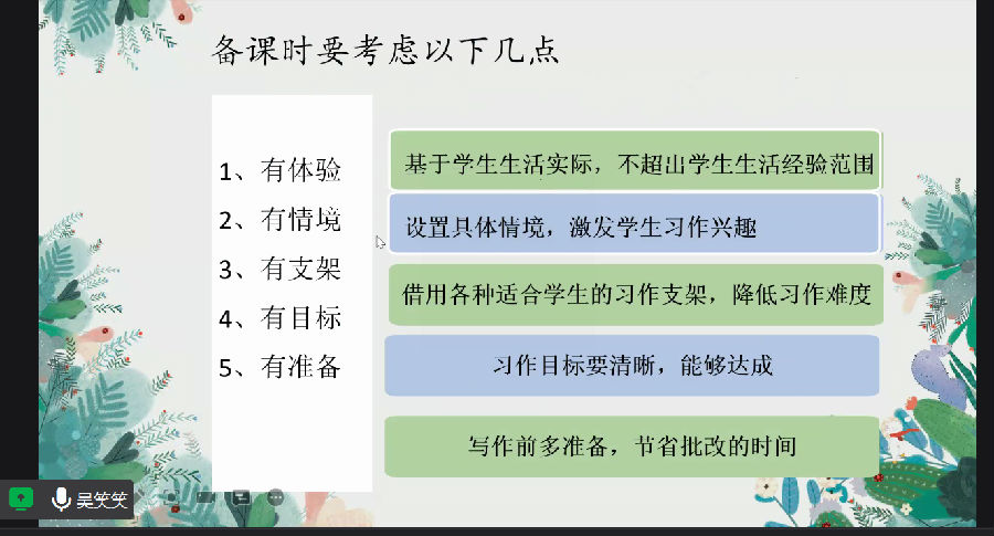 首先第一位分享的是来自县实验二小的吴笑笑老师,她分享的主题是—— 《抓好习作课堂,落实习作技巧》。她主要从以下五方面落实好课堂,分别是:有体验有情境有支架有目标有准备。特别是在准备这一环节,她将自己学习到的习作技巧如“五感法、扩词扩句法…”倾囊吐出,让我们感受到她对习作教学的专注与热情!
