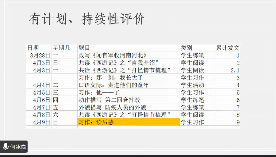 何冰赢老师从练、评、改三个维度分享了自己的习作经验。首先,她分述了在习作练写实践中中摘抄、漂流日记、小练笔的优缺点;随后分享了班级展示板、公众号发布、随堂课精讲习作亮点等评价方式,这些评价注重多时空、多主体、多维度,有一定实操性;最后她提及分层次精简效率的提高改作的方式,也为老师们改作减负提供了些参考。