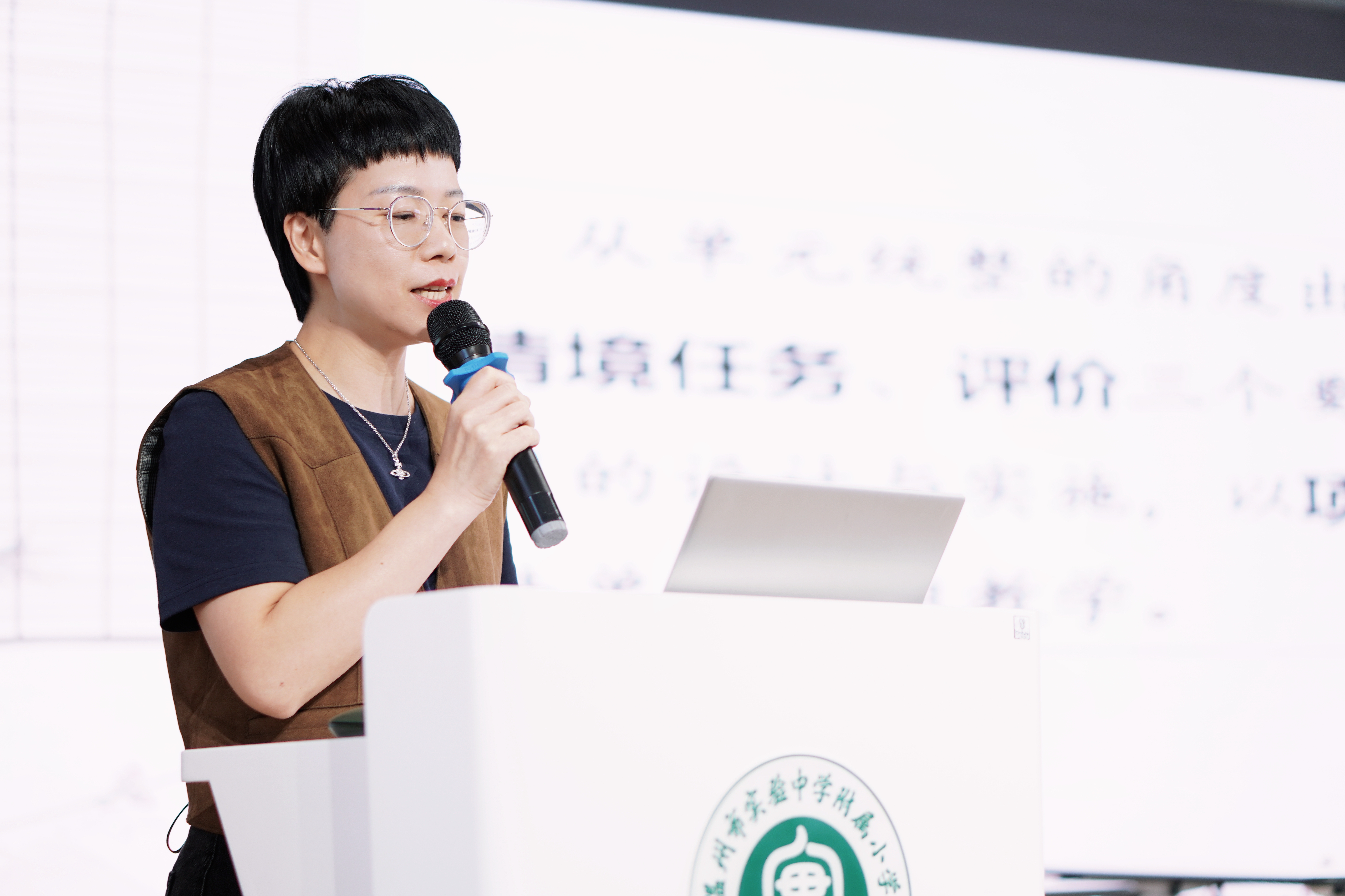 在课例展示之后,温州市百里路小学的许小敏老师带来了题为《诗意秋天——任务群视野下一年级上册第五单元整体教学》的观点报告。许老师立足“文学阅读与创意表达”,设计了符合时令、富有童趣的三个真实情境任务,建构了学习任务群视域下的单元教学设计。在单元目标的导向下,根据语文实践活动统整了整个单元的评价表,达成教学评一致性的目标。许老师以学情为基,以素养为根,将识字阅读有机融合,促进了学生阅读能力的成长。