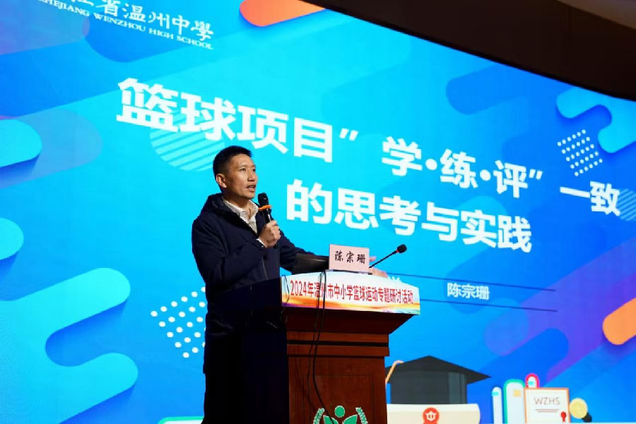 专题讲座环节中,浙江省正高级教师、温州市第五十一中学陈宗珊作了题为“篮球项目‘学、练、评’一致的设计与实施”的专题报告。他详细阐述了篮球教学要以“以知识与技能为本”向“以学生发展为本”转变。通过创设丰富多彩、生动的课堂组内赛、校本课程、大课间、篮球赛等情境,呈现课内学、课后练、校内赛、综合评等四位一体的实施系统,达成学习目标,培育学科核心素养。