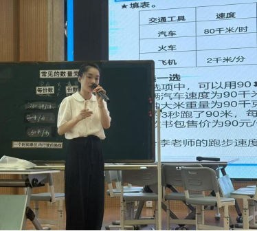 紧接着是学员李冰峰老师带来“以核心概念推到数量关系的整体建构”——《速度、时间和路程》示范说课,李老师从教材分析、课标解读、学情研判、课标解读、核心观点、目标预设和教学过程,结合具体的情境出发,深刻剖析了“每份数、份数和总数”之间的关系。以 “目标精准、逻辑严密、素养落地” 的范本,为学员勾勒“说课应有的模样”,让“实质”二字具象可感。同时板书层次分明,屏幕练习设计紧扣本质。