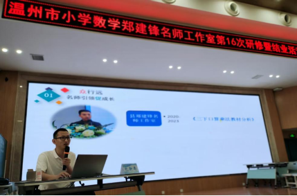总结环节先由吴立强老师带来“研路回顾”,用图文串联研修点滴——每个学员共同磨课、评课、上课、讲座的日子如电影浮现,惹来全场会心一笑。用图文展示两年来在导师郑老师的指导下,每位学员的获奖和收获,每个学员都非常的感谢感恩郑老师。